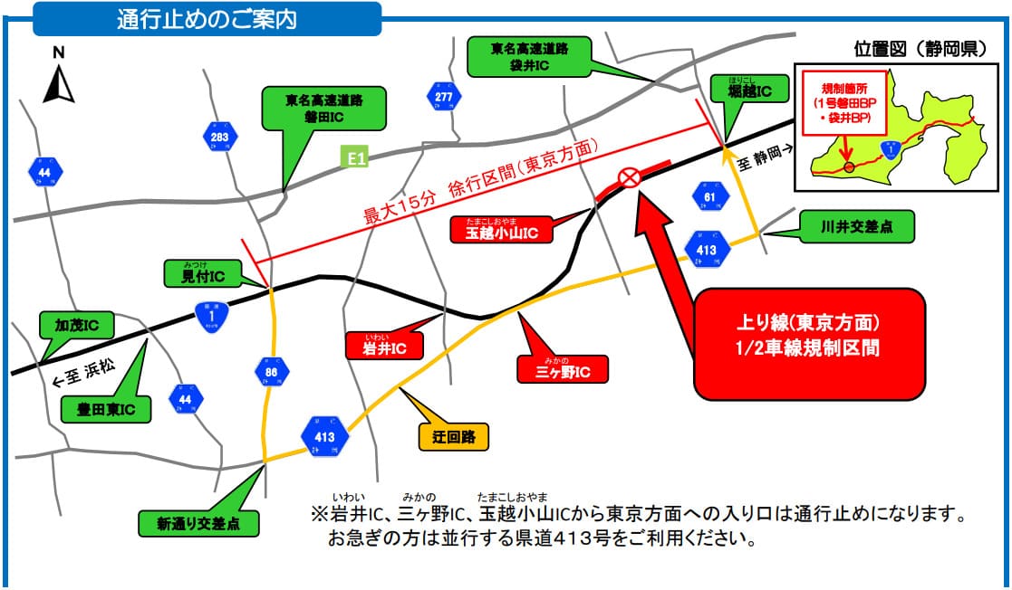 お急ぎの方は、見付ICより県道413号への迂回にご協力ください。