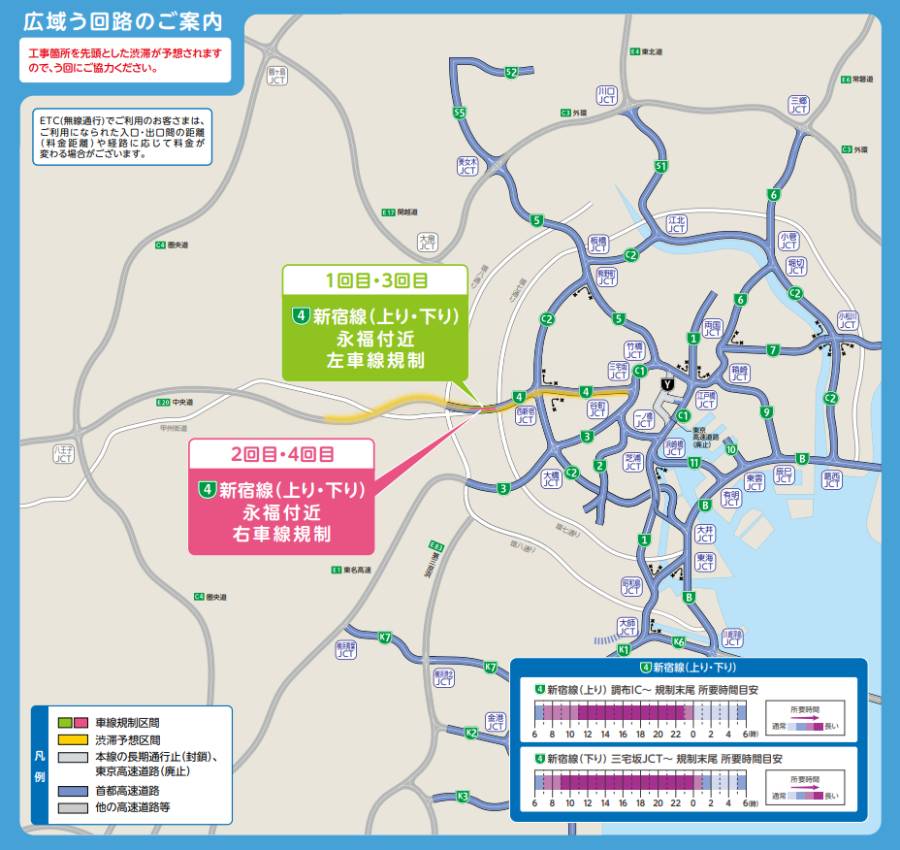 首都高より、永福付近で床版連結工事を行うため、車線規制と通行止を行う旨のお知らせがございましたのでお知らせいたします。