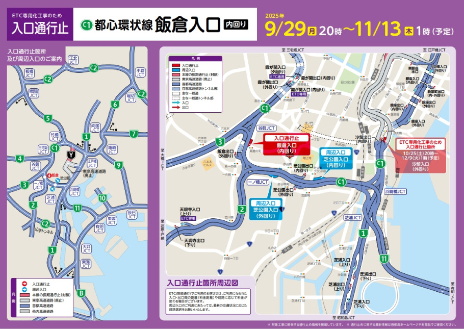 詳細については、概要内の「都心環状線(内回り)飯倉入口における通行止めのお知らせ」のリンクでご確認ください。