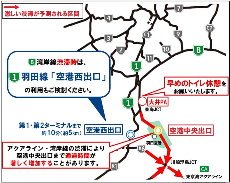 特に、湾岸線はアクアラインを先頭とする渋滞が予想されるため、東京方面から羽田空港をご利用になる場合は、1号羽田線空港西出口の利用もご検討ください。
