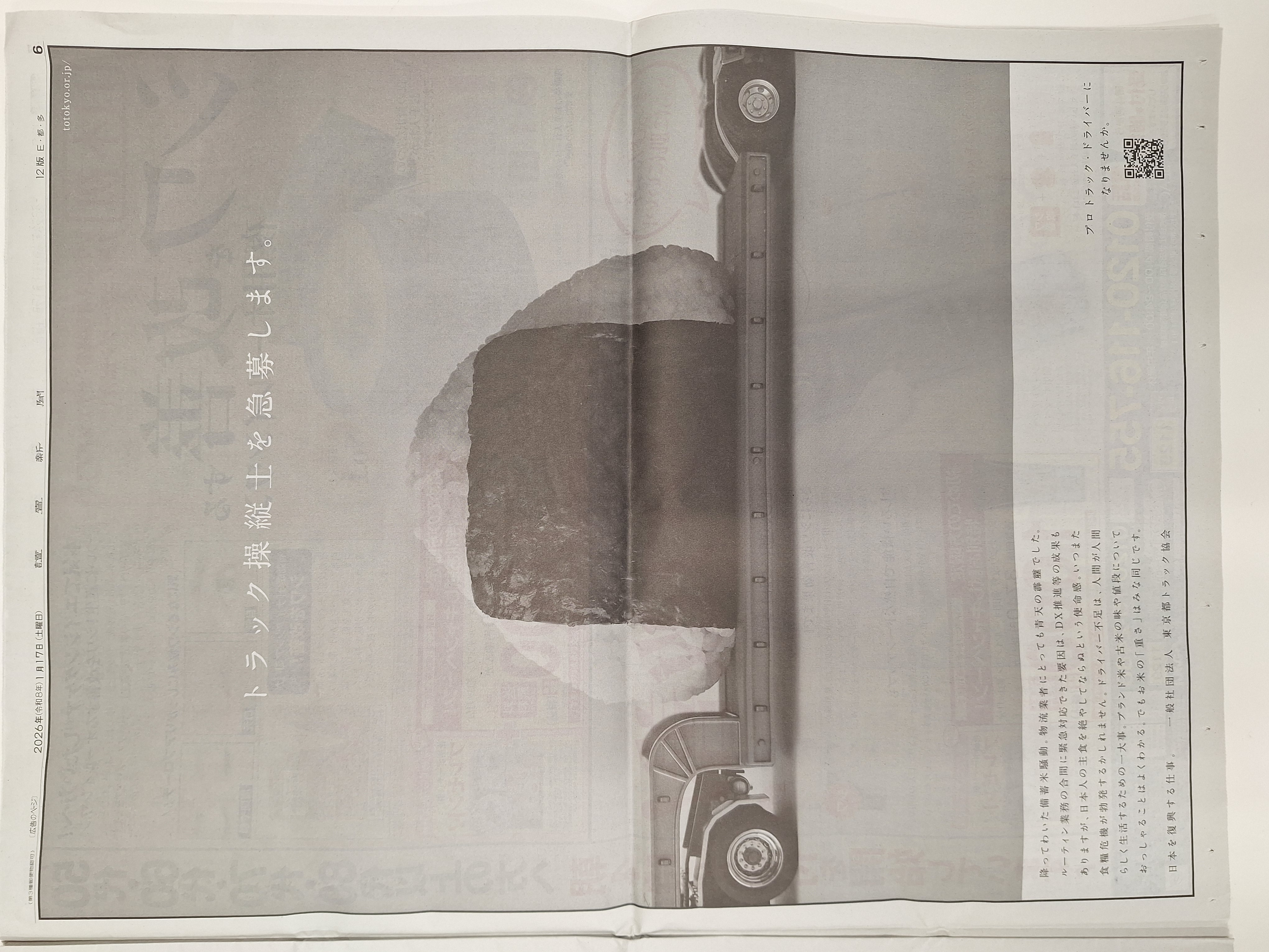令和6年4月1日から施行された「自動車運転者の労働時間等の改善のための基準(改善基準告示)」を受け、改めて取り沙汰される物流の2024年問題の周知と理解促進を図り、会員事業者の労働時間短縮及び人手不足解消に向けた人材を確保するため、トラック運送業界が抱える諸課題(人材確保対策・労働時間短縮・燃料高騰問題)や、取り組み、役割などについて、都民や荷主の理解を促し、もってトラックドライバーの労働環境を改善し、働き方改革を推進するため、読売新聞都内版・多摩版に2026年1月17日(土)に第1回として、3週にわたり週1回のシリーズ広告を掲載します。