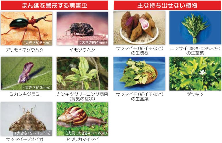 農林水産省は、農作物に被害を与える病害虫のまん延を防止するため、沖縄県、奄美群島、トカラ列島及び小笠原諸島からの寄主・宿主植物等の移動を規制しています。