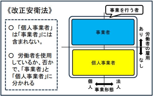 安全衛生対策法においての「個人事業者」は「事業を行う者で労働者を使用しないもの」であり、労働者を使役するか否かで判断すること