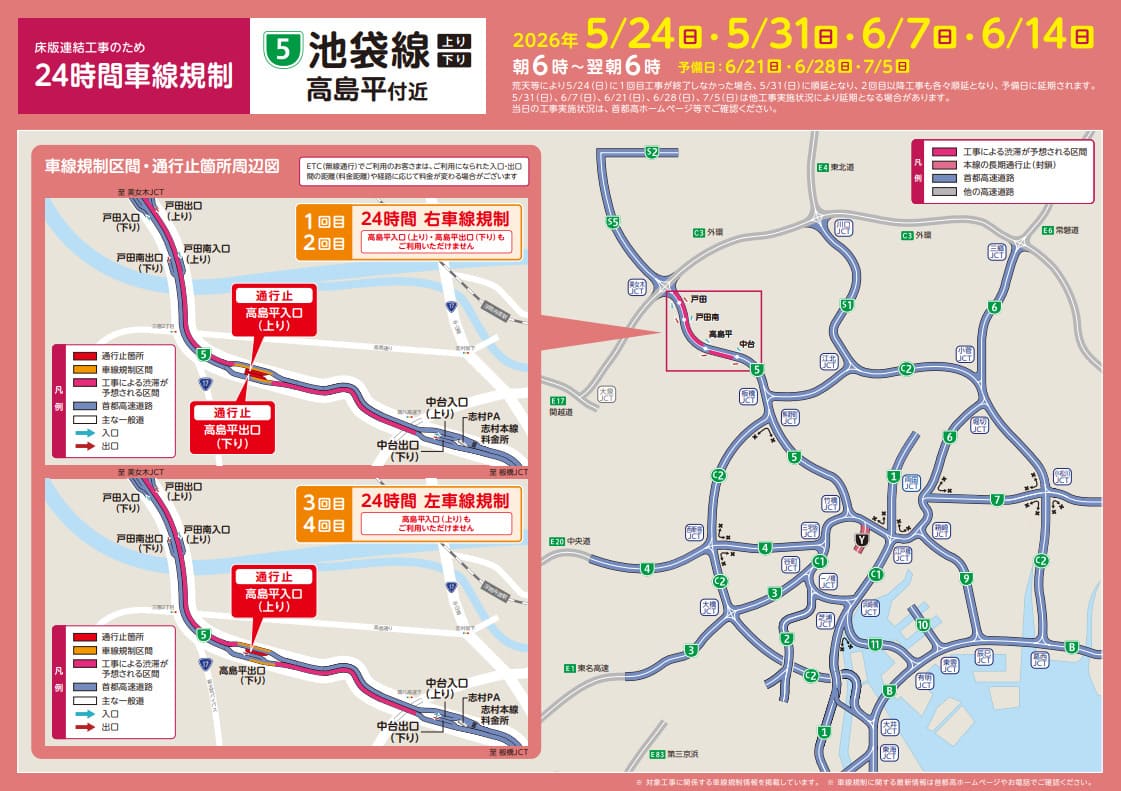 - 2026年5月24日(日)朝6時~翌朝6時 右車線規制